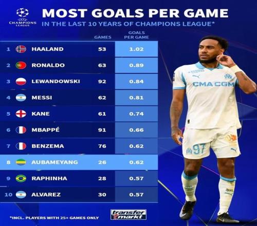 北京時間11月26日,德轉(zhuǎn)統(tǒng)計出了近10年歐冠場均進球數(shù)排名前10的球員,哈蘭德以場均1.02球高居第一,C羅0.89球第二,梅西0.81球第四,在本輪歐冠比賽中完成梅開二度的奧巴梅揚以0.62球位列第八位。